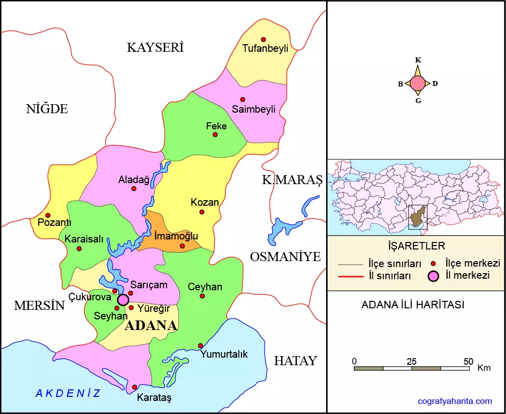 Adana İlini ve Adana İlçelerini Gösteren Harita
